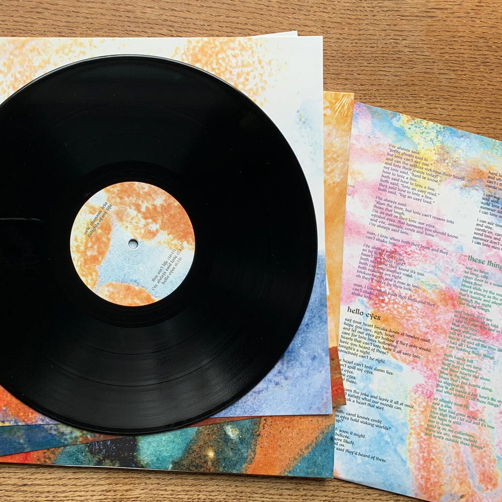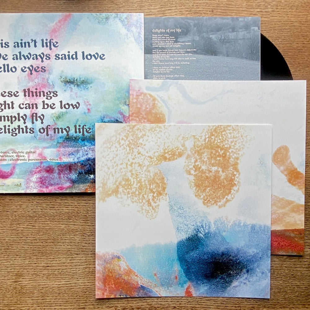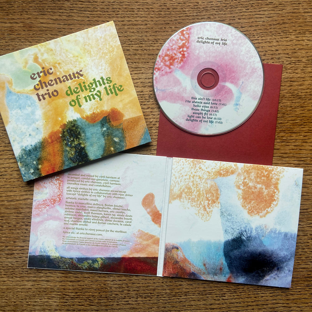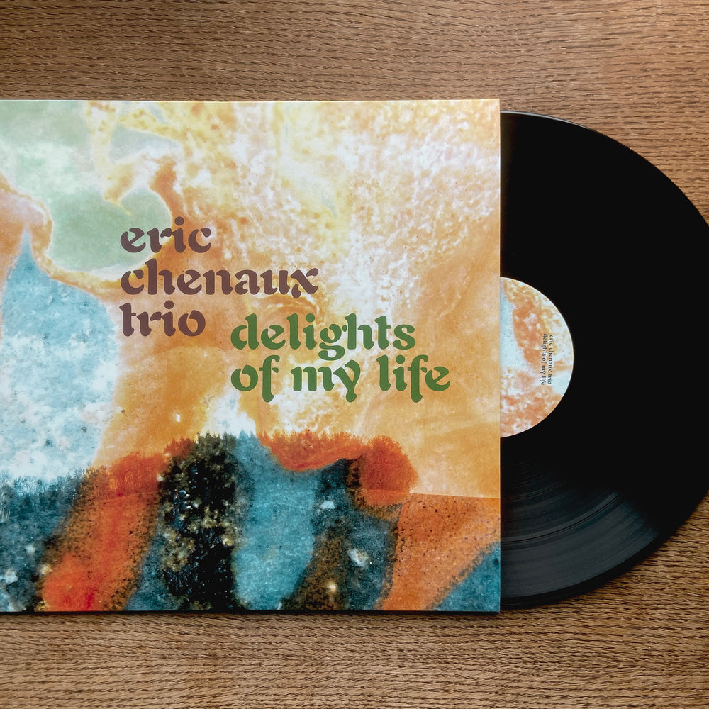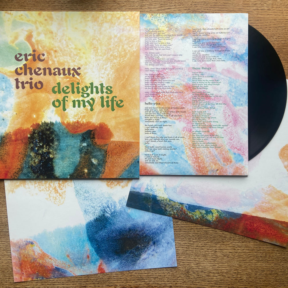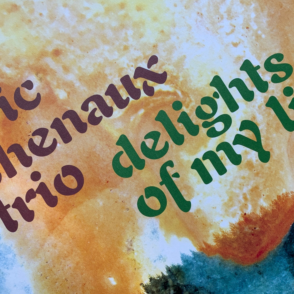 In many ways Delights Of My Life also picks up right where Chenaux’s previous album left off, in its subversions of a classic, timeless jazz-inflected balladry, while the interplay of the trio formation indeed unfurls many new delights. Recording together at Chenaux’s spartan home studio in rural France, Driver’s harmonically warped organ and Melanson’s electroacoustic sampling and percussion hold time in newfound ways. Where previously Chenaux relied on a freeze/sustain pedal and minimalist rhythmic triggers to generate both pulse and chordal foundations, Melanson now paints timekeeping with expressive and intricate colourations, through live deployments of fluid sampled percussion (including orchestral timbres like timpani, kettle drums, and woodblock) that blur the boundaries between acoustic and electronic. Driver also ramps up his role in the song arrangements (prefigured in his support playing on Say Laura), teasing out chords and melodic filigree on Wurlitzer that percolate more prominently with Chenaux’s signature fried guitar solos and succulent singing. Both trio members add dulcet backing vocals, most notably on the 10-minute tour-de-force of fuzzed and ring-modulated swing “This Ain’t Life” that opens the record. All seven songs on the album groove and sway, simmer and sparkle, like nothing in the inestimable Chenaux discography to date.
