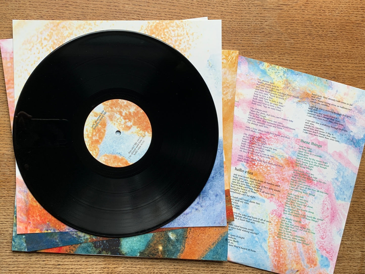 180gLP pressed at Optimal (DE) comes in 350gsm jacket + 300gsm inner + two 12”x12” 300gsm art cards, all printed in LE-UV inks on uncoated Arktika artboards, with DL card. Artwork by Mariette Cousty.