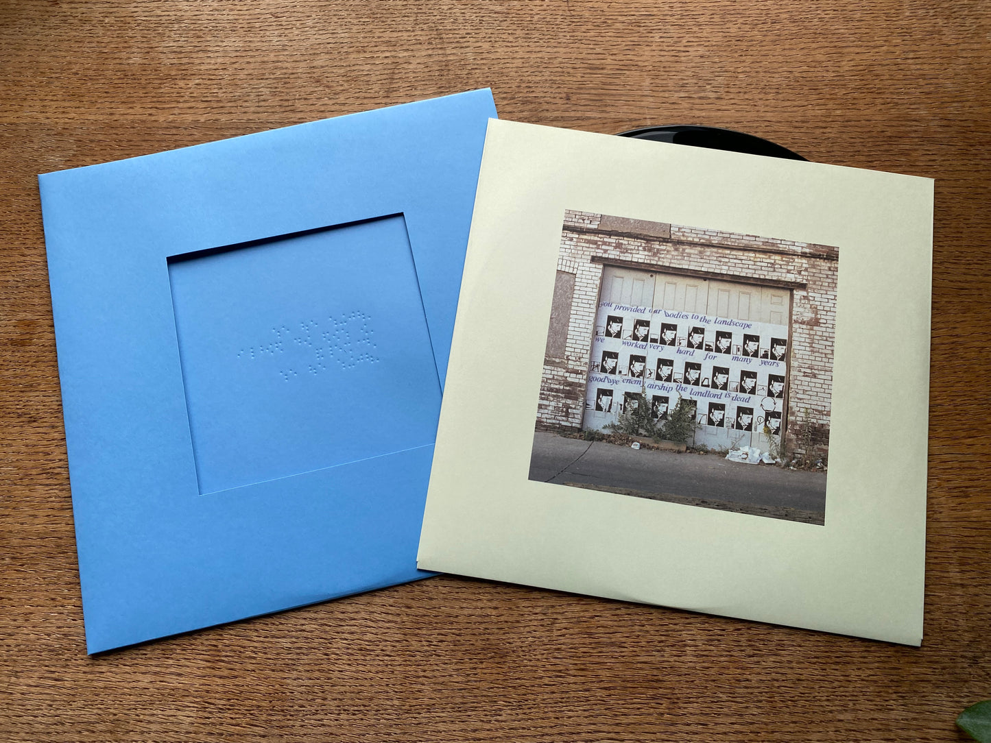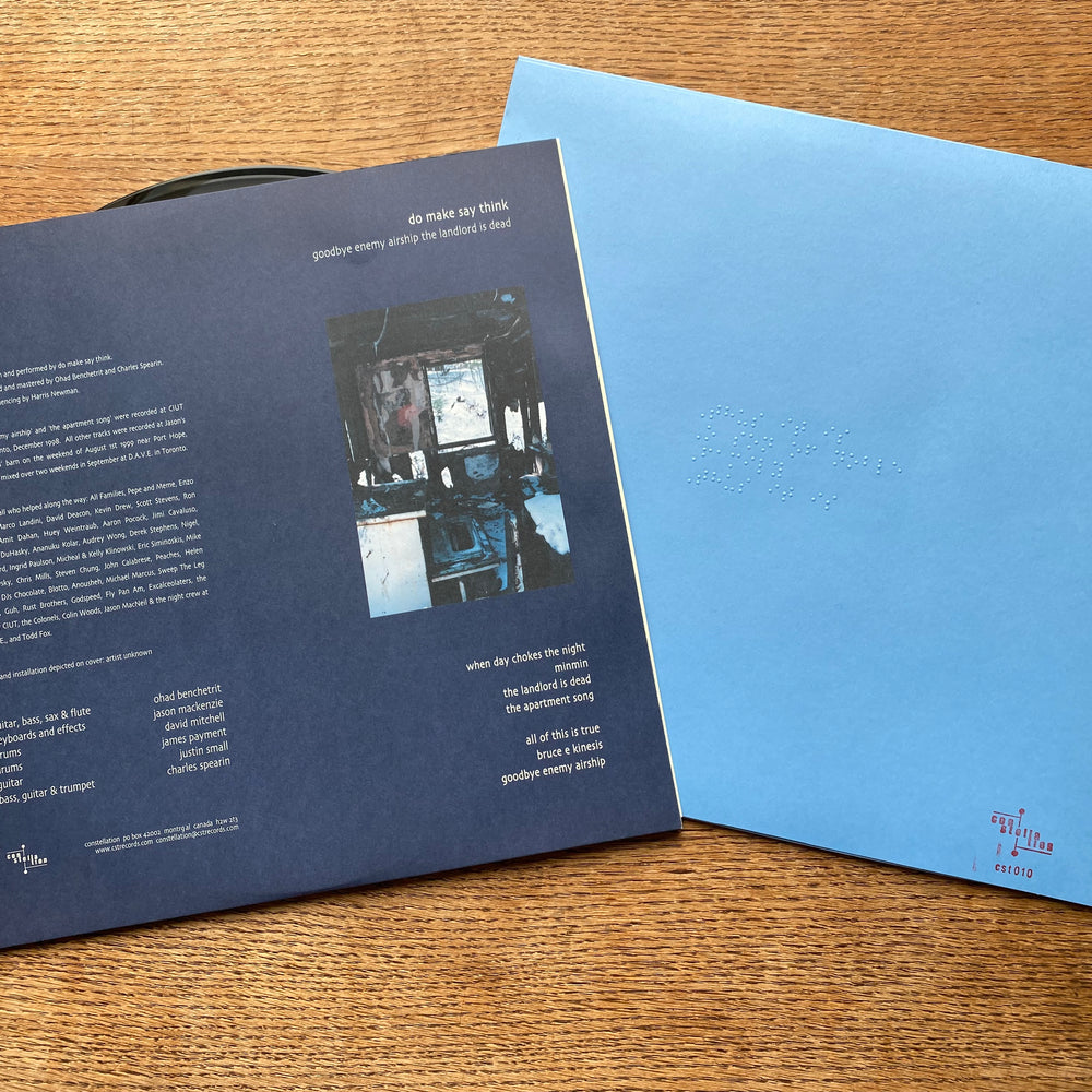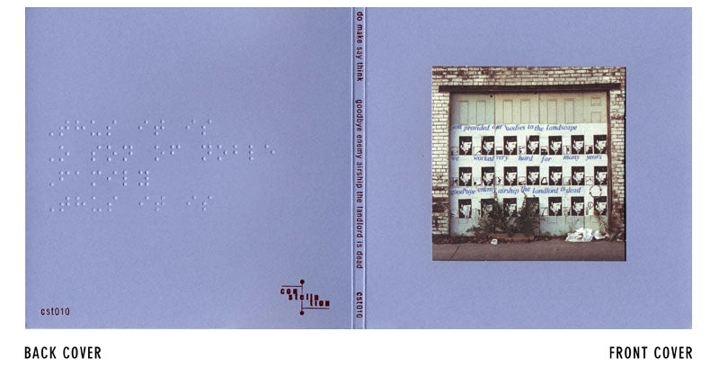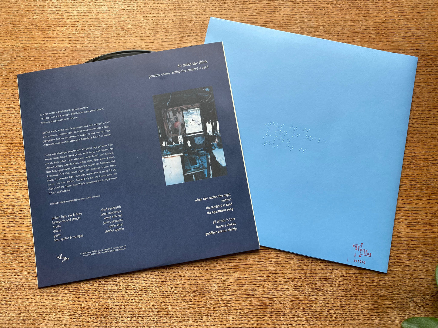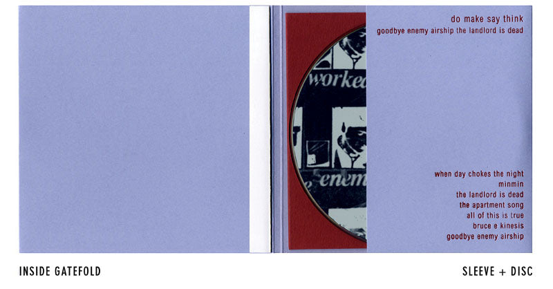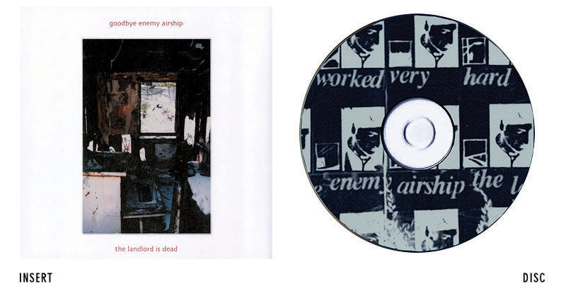 Goodbye Enemy Airship the Landlord is Dead is available on LP and CD formats, both packaged in cardstock jackets with window-cut front covers, embossed braille back covers and screen-printed exterior lettering.