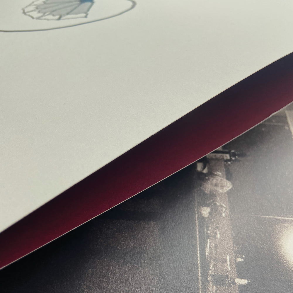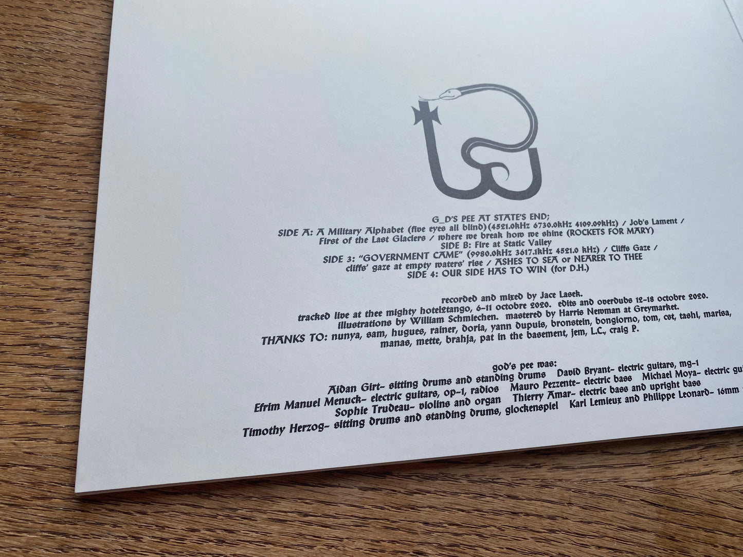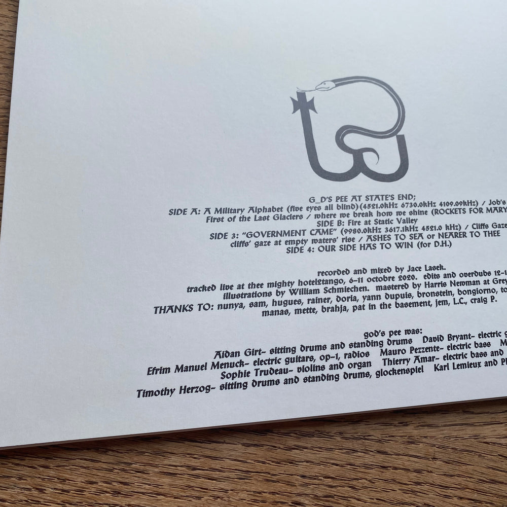 Just as STATE’S END summons the gamut of Godspeed’s constituent sonic trademarks, so the album artwork spans the entirety of the band’s visual history: the grainy monochromatic photography of recent releases finds its way onto the inner sleeves, while the gatefold cover art harkens back to the iconic graphics of earlier classic records like Slow Riot For New Zero Kanada and Lift Your Skinny Fists Like Antennas To Heaven. STATE’S END features illustrations by William Schmiechen, with the front cover taijitu flowers and back cover tear gas canisters rendered in raised thermographic black ink on the double-vinyl album jacket. The illuminated cross from Godspeed’s debut F#A#∞ also makes a reappearance on the inside gatefold drawing, in recurrent homage to the electrified hilltop landmark crucifix of the band’s Montréal hometown.