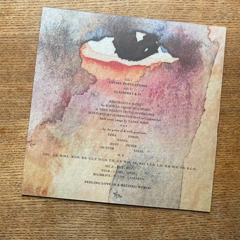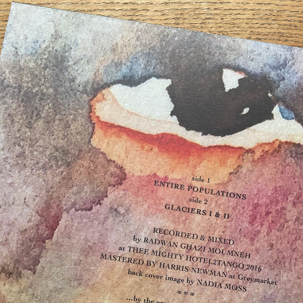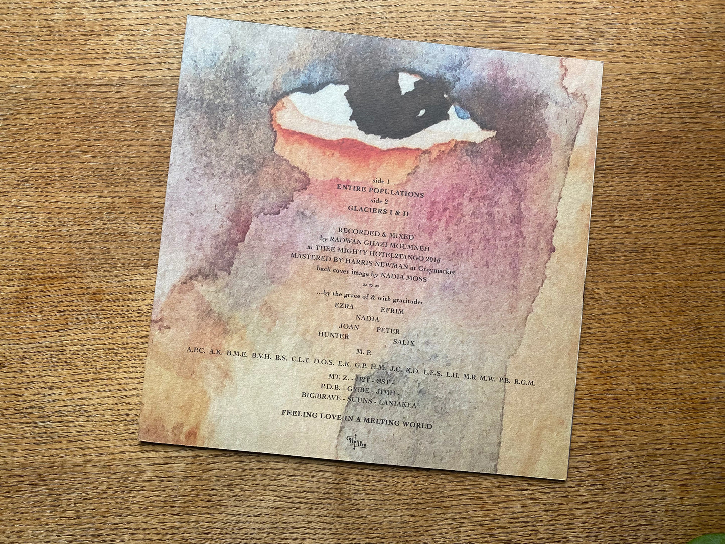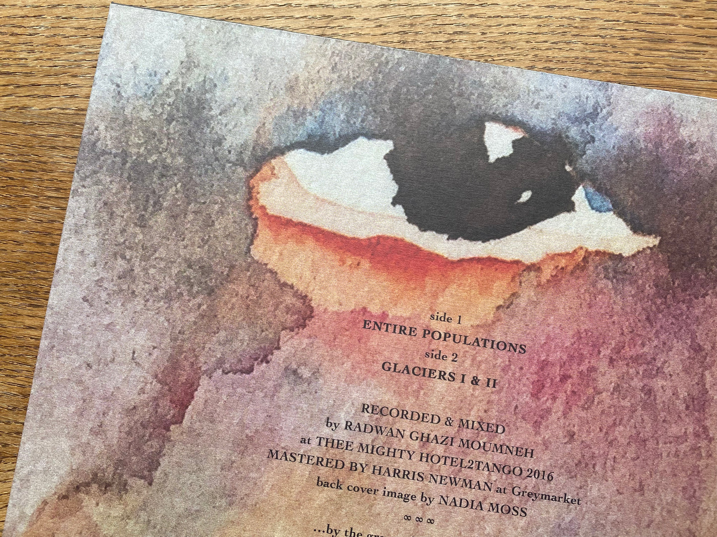Comprised of two side-length multi-movement compositions, Pools Of Light unfolds at a stately, inexorable pace, combining sound-art and signal-processed timbres, extended melodic and contrapuntal lines, and the periodic deployment of stark, minimalist vocals. “Entire Populations” is a 24-minute tour de force on Side One, opening with gently blown-out solo violin layering a maqam- and klezmer-inflected theme that gradually recedes to near-silence as vocals are introduced, with Moss singing a single phrase (anchored by the song’s title) which builds up anew in careening stacked vocal loops, towards a majestic juxtaposition of dive-bombing electronics and strident melodic string excursions, ending in a tender scorched-earth denouement. “Glaciers I” and “Glaciers II” on Side Two are more explicitly textural and cinematic, moving between minimalist and maximalist, widescreen and intimate, ice and heat; a highly compelling suite of drone-inflected, nuanced and subtly plaintive instrumental pieces.