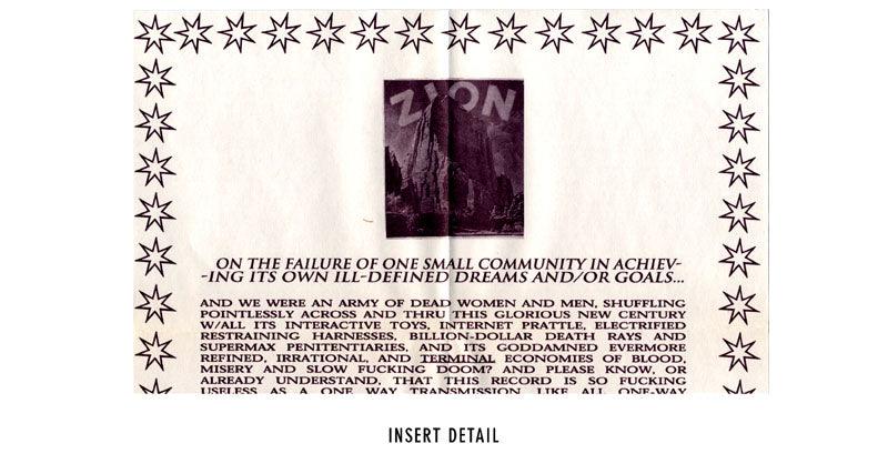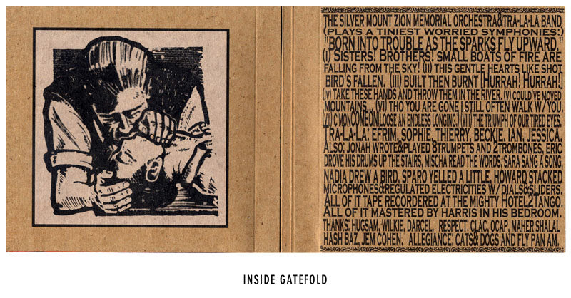 The second Silver Mt. Zion album featured an expanded band, with a similarly expanded band name. The addition of cello, second violin and second guitar allowed SMZ to develop richer, denser arrangements while preserving live ensemble playing. The opening instrumental pieces picked up where the debut left off, with found-sound loops and treatments introducing repeated melodic themes that move slowly through various counter-melodies — the greater breadth of instrumentation brought extra subtlety, complexity and harmonic range to bear on these neo-classical dirges. Guitars and vocals moved to the fore on the album’s centrepiece tracks. “Take These Hands And Throw Them In The River” is an astounding juxtaposition of rhythmic thrust and ricocheting vocals, driven by a battered lyrical paranoia that conjures equal parts fear and rage. The calm after this storming piece comes by way of another vocal tune, this time fragile and near-whispered, with dual lines that alternately mask and reinforce each other. A piano and cello interlude prefaces the last side of the record, which features two guitar-driven songs, the first a blazing rock piece that builds to an exuberant distorted climax, the second as close to a pop masterpiece as this band is likely to craft, highlighted by a lovely arpeggio guitar riff and the defiant refrain “musicians are cowards”. While remaining anchored in an underlying sadness and mourning over this failed world, this album reveals an angrier, more urgent face as this unique ensemble charted ever-widening sonic and emotional terrain.