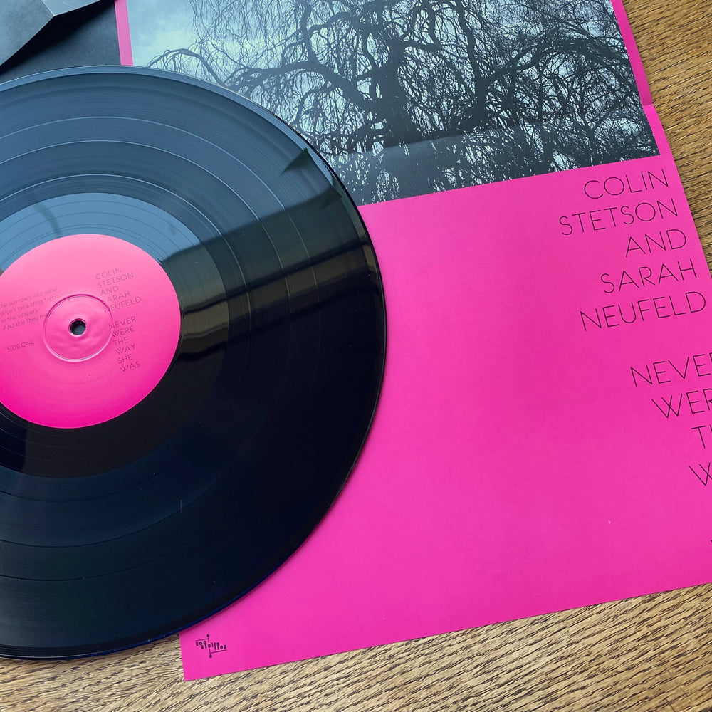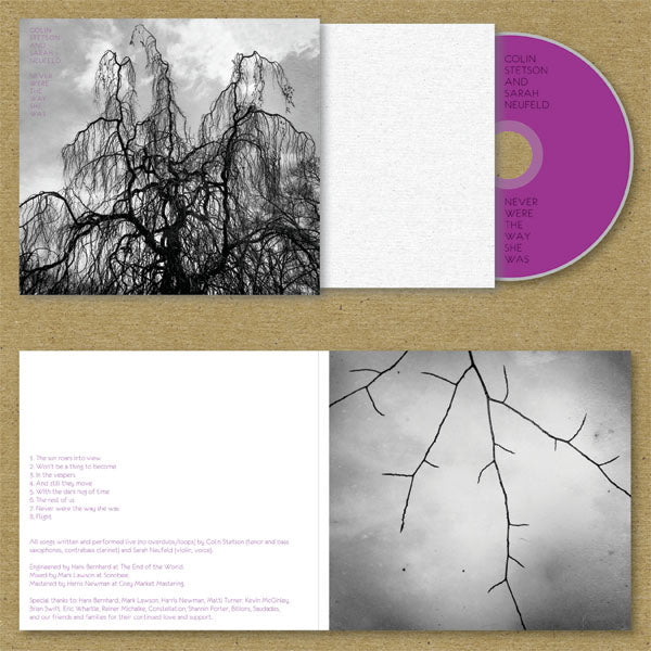 Never were the way she was is guided by the metaphorical narrative of the life of a girl who ages slow as mountains; excited, exalted, and ultimately exiled in her search for a world that resembles her experience. The album's expansive sonic trajectory and multiplicity of structures and voicings belies the fundamental economy of two acoustic instruments combining in real time. The result is a musical chronicle that powerfully establishes its own spatial and temporal horizon, a soundtrack that requires no images but profoundly compels the imaginative. From the filigreed ostinato polyrhythms of “The sun roars into view” and “In the vespers” to the stately long tones of “And they still move”, the dark drone-inflected sea-saw waltz of “With the dark hug of time” to the growling, pulsing thrust of the album’s epic centerpiece “The rest of us”, Stetson and Neufeld offer up an incredible (and impressively diverse) integration of composition, performance, timbre and texture while holding their respective instruments in sparkling juxtaposition. Never were the way she was is a sum quite definitively and thrillingly greater than its parts.