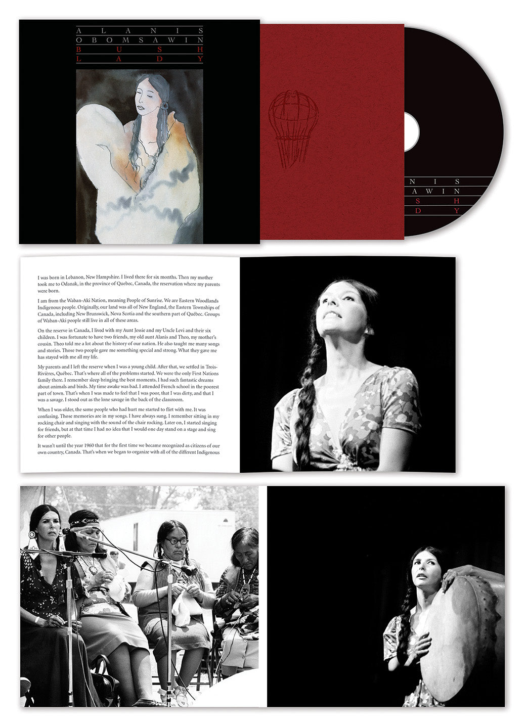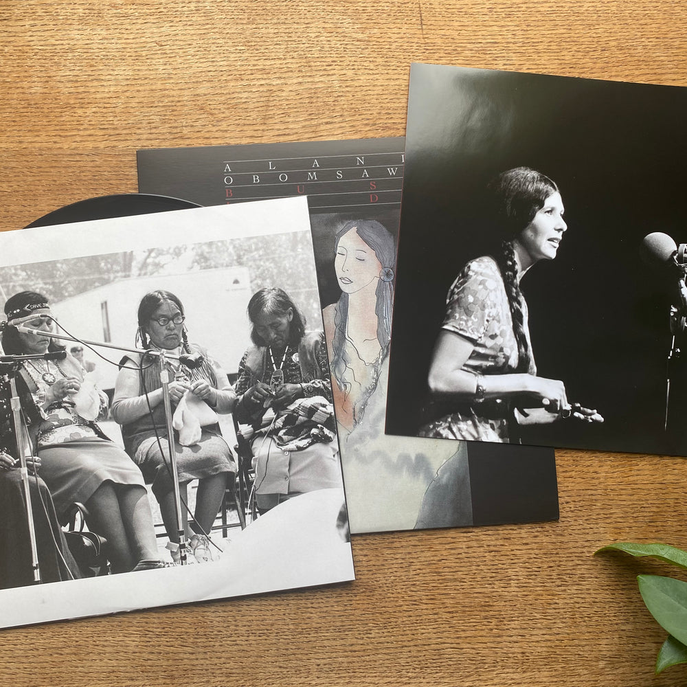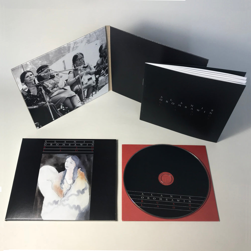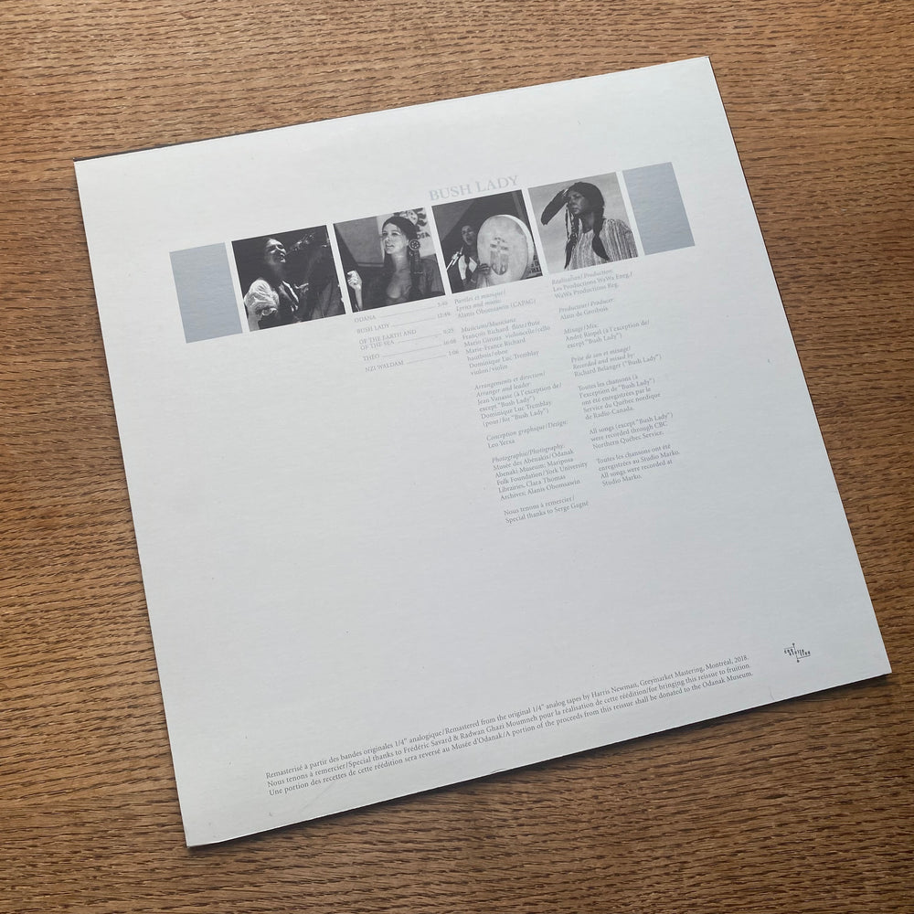 Obomsawin kept her musical output percolating alongside her burgeoning documentary film career, with performances at the legendary Mariposa Folk Festival among others. In the mid-1980s Canada's national broadcaster (CBC Radio) invited Obomsawin to record an album; unsatisfied with these recordings, she reclaimed the master tapes, remixed the material, re-recorded the title track from scratch, and issued the ensuing Bush Lady album on her own private press in 1988 complete with her own artwork and liner notes. Lacking formal distribution - and with Obomsawin focused primarily on her documentary film career - only a portion of this pressing was sold at the time, the remainder occupying a closet in her Montréal home. The album has grown to become an increasingly legendary rarity ever since.