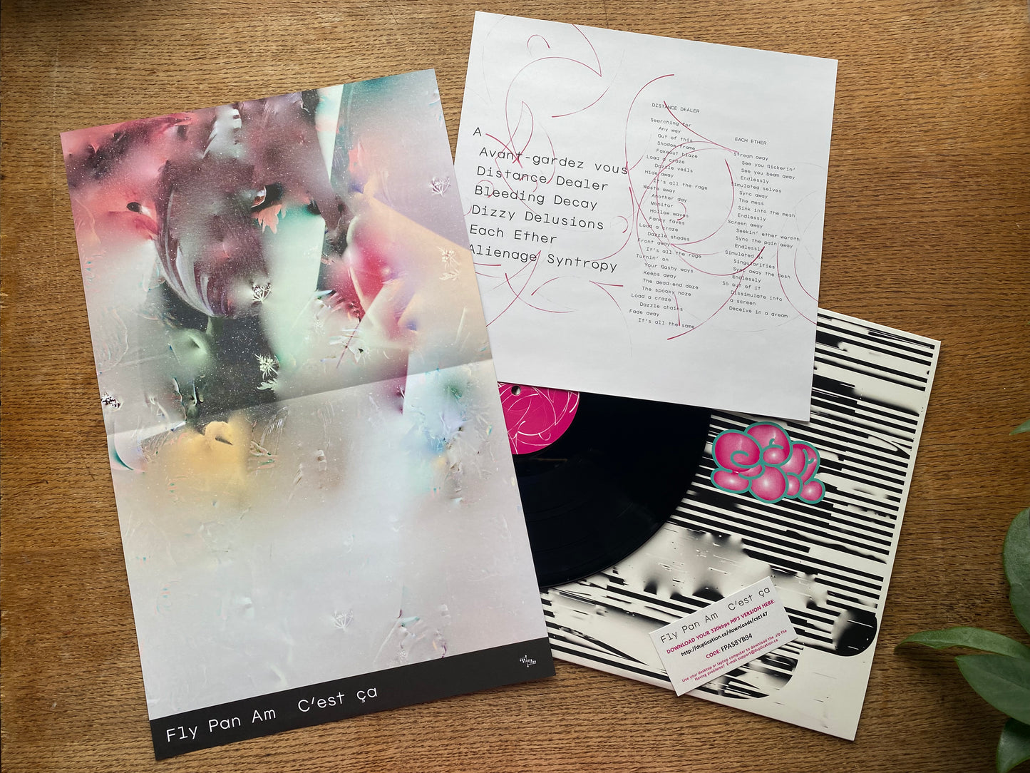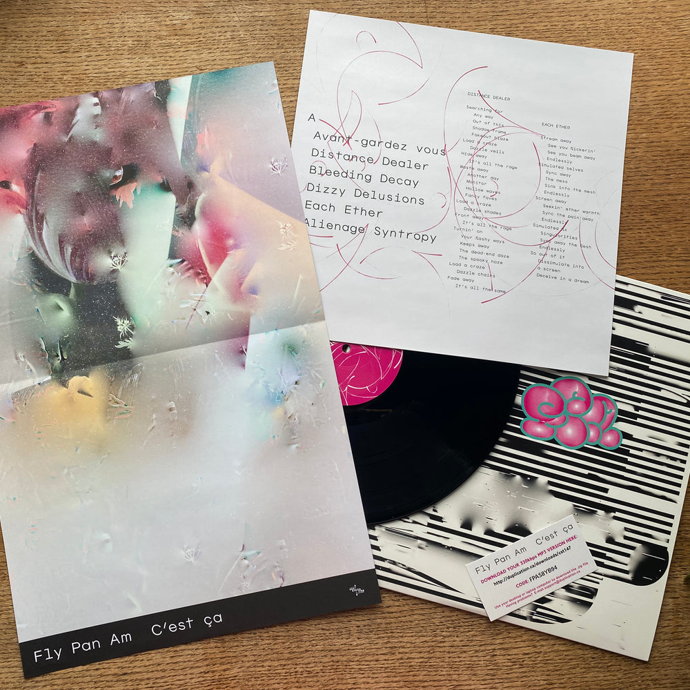 C'est ça is a brilliant return to form for Fly Pan Am – an album of renewed vitality and experimentation where rock structures underpinned by J.S. Truchy’s trademark rapid-fire bass and Félix Morel’s disciplined, ascetic drumming are submerged beneath waves of processed guitar by Roger Tellier-Craig and Jonathan Parant, with fluorescent noise treatments and sonic vandalisms wrought by all four. “Distance Dealer”, “Each Ether” and “Interface Your Shattered Dreams” nod to important influences like MBV and Hüsker Dü, while collapsing into/out of themselves in various ways. “One Hit Wonder”, “Bleeding Decay” and “Discreet Channeling” vault some of Fly Pan Am’s earliest reference points into the present: namely, the intrepid proto-Kosmiche of This Heat and Can, and later style-adjacent torchbearers like Boredoms, Flying Saucer Attack and Trans Am.