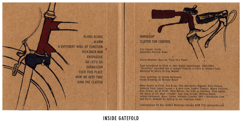 By pushing the boundaries of what a bow and a pair of drumsticks can deliver, the Montreal-based viola and drums duo Hangedup mesmerized audiences for years. The band steadily expanded its strategies and sonics over its 5-year history and was at the peak of its powers with Clatter For Control, the third and final full-length. Gen’s bi-amplified viola rig, linked to a live audio looper, creates a vortex of jigs, reels and air-raid drones, pummeled along by some of the heaviest polyrhythmic skinbeating we’ve ever heard. An unbelievably beautiful racket that finds the band utterly on fire, swooping and slamming around with varying degrees of controlled chaos. Both noisier and more melodic than anything they had yet put to tape, Hangedup raised their compositional and improvisational bars on Clatter For Control. Eric and Gen played as if sharing the same cortex and spine.
