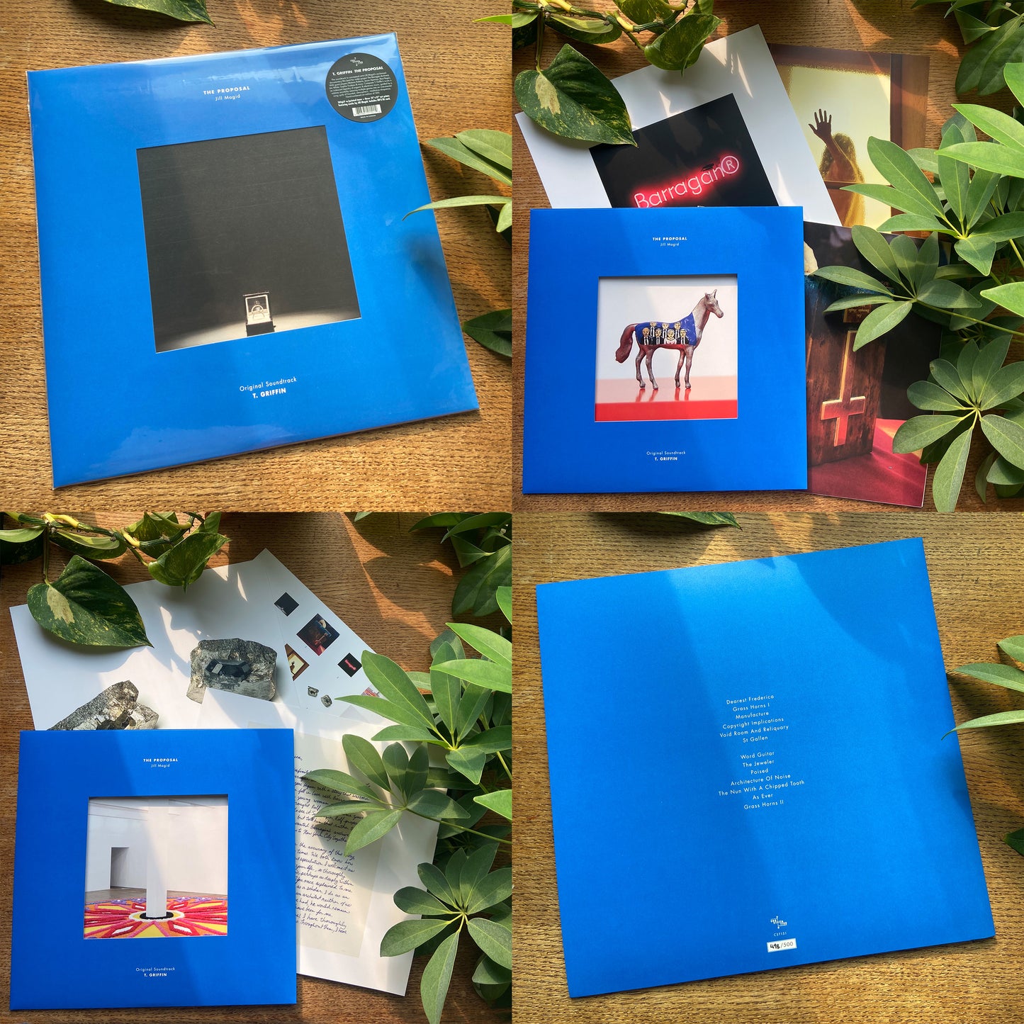 Deluxe 180gram LP is a hand-numbered art edition of 500, in a window-cut jacket printed Pantone Blue (inside and out) on uncoated acid-free 110lb cover stock, with an artworked inner sleeve on 100lb artboard and a set of four doubled-sided 12"x12" lithograph art cards printed on 100lb Creator Silk artboard, all featuring works from The Barragán Archives and The Proposal by Jill Magid.